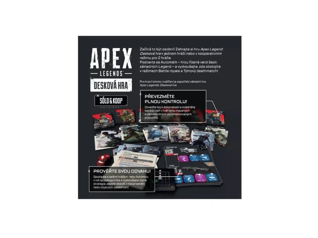 Rozšíření Solo and Co-op Expansion, které navrhli Radek Ignatów a Dávid Turczi, přináší možnost hrát Apex Legends: The Board Game v režimu pro jednoho hráče nebo ve spolupráci s dalším hráčem proti skupině automatizovaných protivníků.