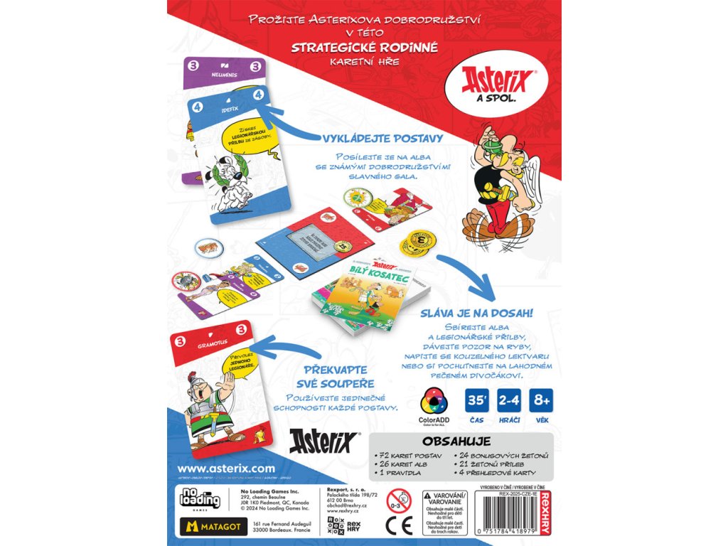 Asterix a spol. je zábavná karetní hra plná interakce zasazená do světa slavného galského hrdiny Asterixe. Během hry se setkáte s mnoha známými postavami z komiksu – jak z galské, tak z římské strany – a budete muset chytře využívat jejich speciální schopnosti, abyste zvítězili v boji a získali hromadu sesterciů!