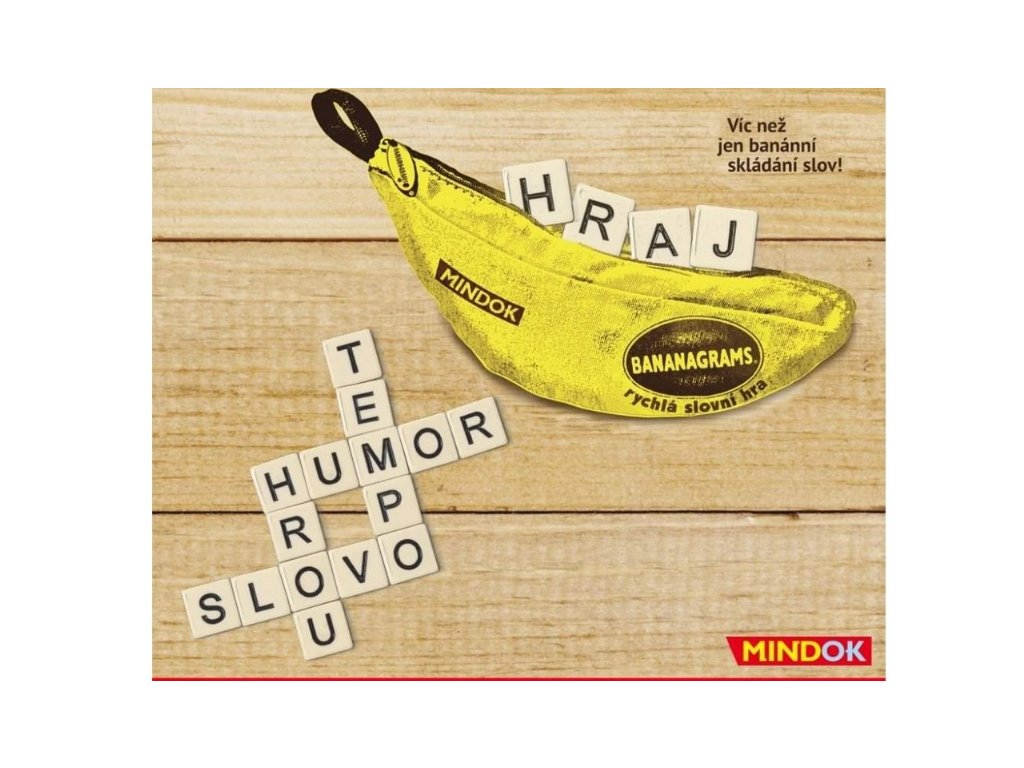 Představujeme geniálně prostou a přitom, troufáme si říct, prostě geniální hru BANANAGRAMS. Co nejrychleji složte písmena do mřížky, zatímco se vás ostatní snaží předběhnout! Žádná tužka, papír, herní plán, ani čekání na svůj tah... jen bleskové skládání písmenek z banánu, který s sebou můžete vzít kamkoli!