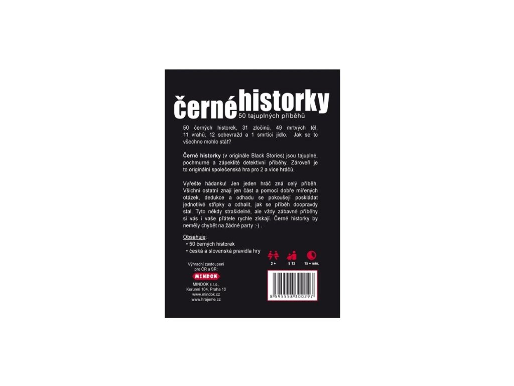 Černé historky jsou temné, záhadné a často mrazivé detektivní příběhy, které se budete snažit společně rozluštit. Jeden z hráčů zná celý příběh, zatímco ostatní mu kladou zvídavé a cílené otázky, aby postupně odhalili, co se skutečně stalo.