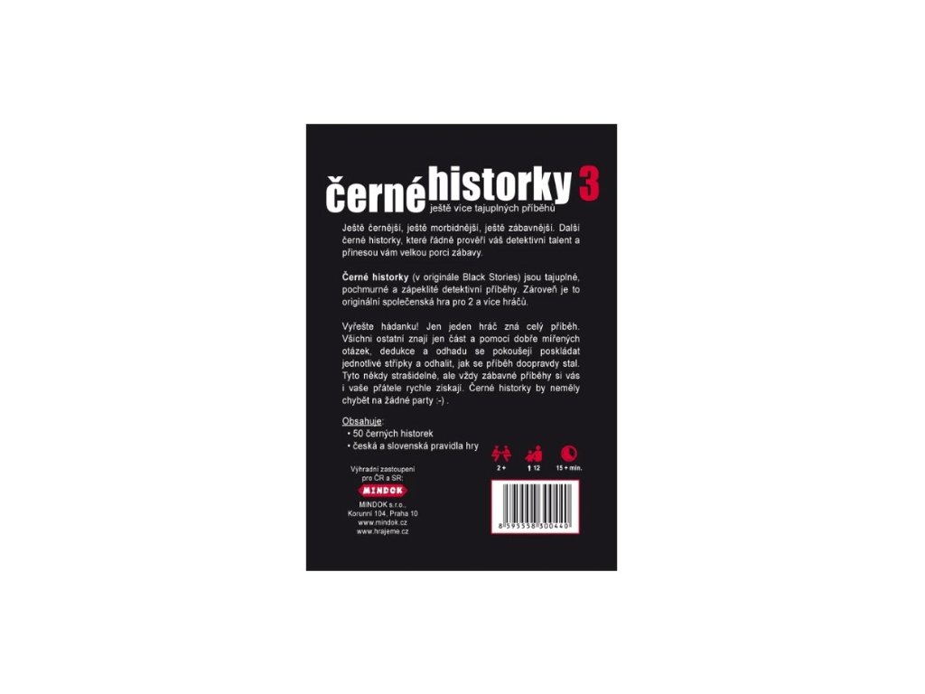 Ještě černější, ještě morbidnější, ještě zábavnější. Další černé historky, které řádně prověří váš detektivní talent. 50 nových příběhů, které vám přinesou velkou porci zábavy. Černé historky (v originále Black Stories) jsou tajuplné, pochmurné a zapeklité detektivní příběhy. Zároveň je to originální společenská hra pro 2 a více hráčů. |