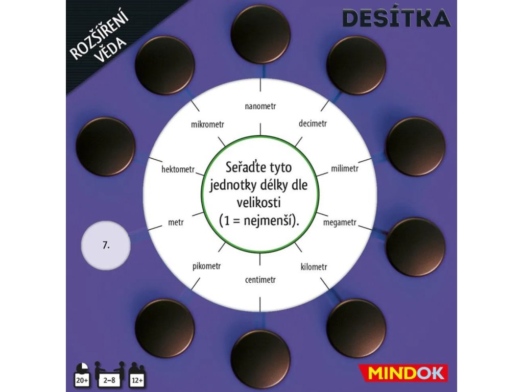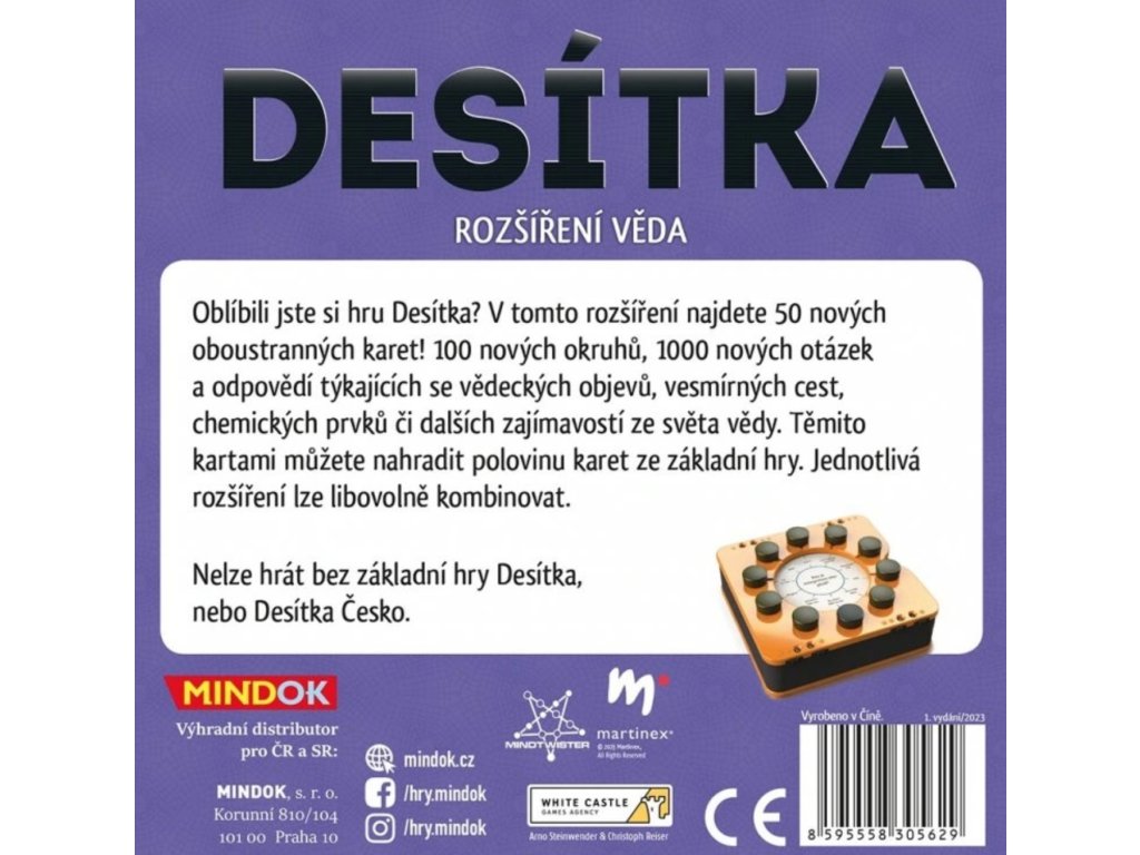 Oblíbili jste si hru Desítka? V tomto rozšíření najdete 50 nových oboustranných karet! 100 nových okruhů, 1000 nových otázek a odpovědí týkajících se vědeckých objevů, vesmírných cest, chemických prvků či dalších zajímavostí ze světa vědy. Těmito kartami můžete nahradit polovinu karet ze základní hry. Jednotlivá rozšíření lze libovolně kombinovat. Nelze hrát bez hlavní konzole (Desítka, Desítka Česko, Desítka Olympijské hry)