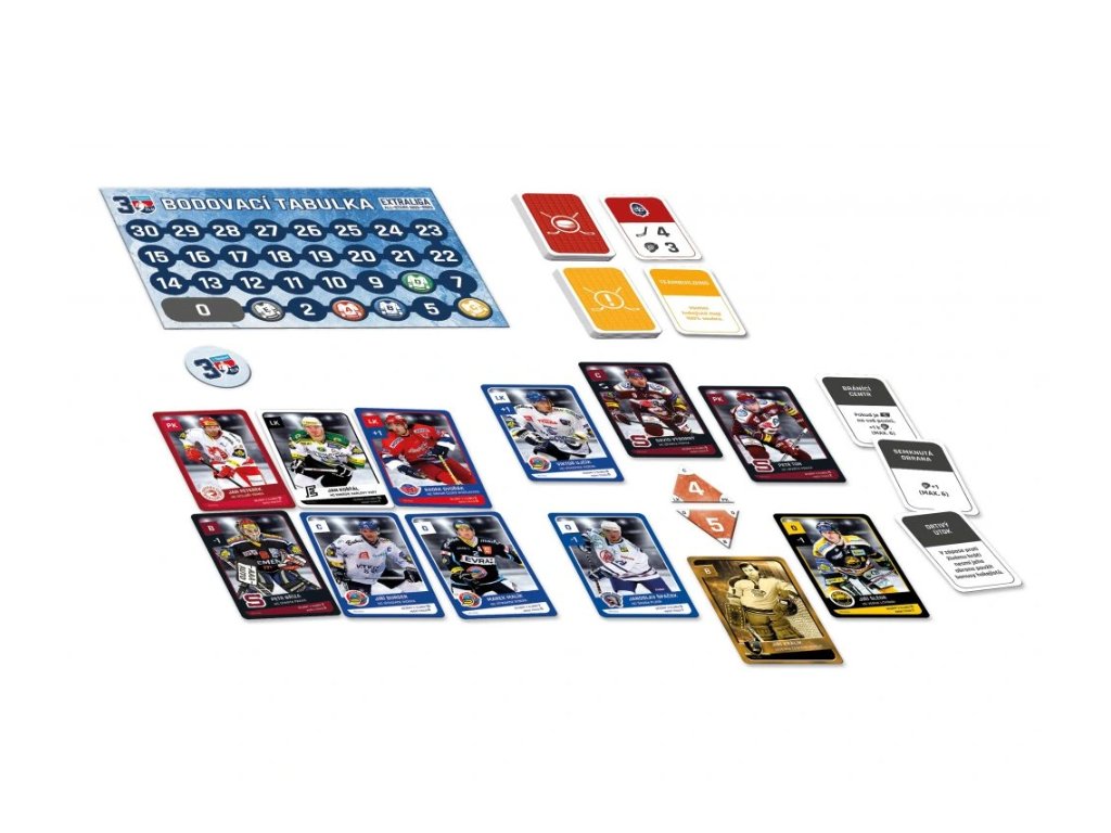 Ve hře najdete 6 karet hokejistů (centr, levé křídlo, pravé křídlo, 2 obránci, brankář) z každého ze 14 klubů, které odehrály extraligovou sezónu 2022/2023 + 3 dalších týmů, které ve třicetileté historii Extraligy získaly titul a navíc 8 karet legend předextraligové éry. Na kartách najdete pozici hráče, klubovou příslušnost, kolik let strávil v Extralize v daném klubu a kolik s ním získal titulů. Dva hráči z každého klubu maní navíc přiřazenou speciální schopnost, díky které mohou během zápasů manipulovat s kostkami.