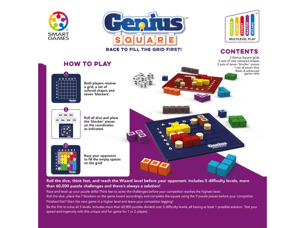 Pěti úrovněmi obtížnosti: Genius Square si užijí malí i velcí hráči, začátečníci i ostřílení stratégové.
