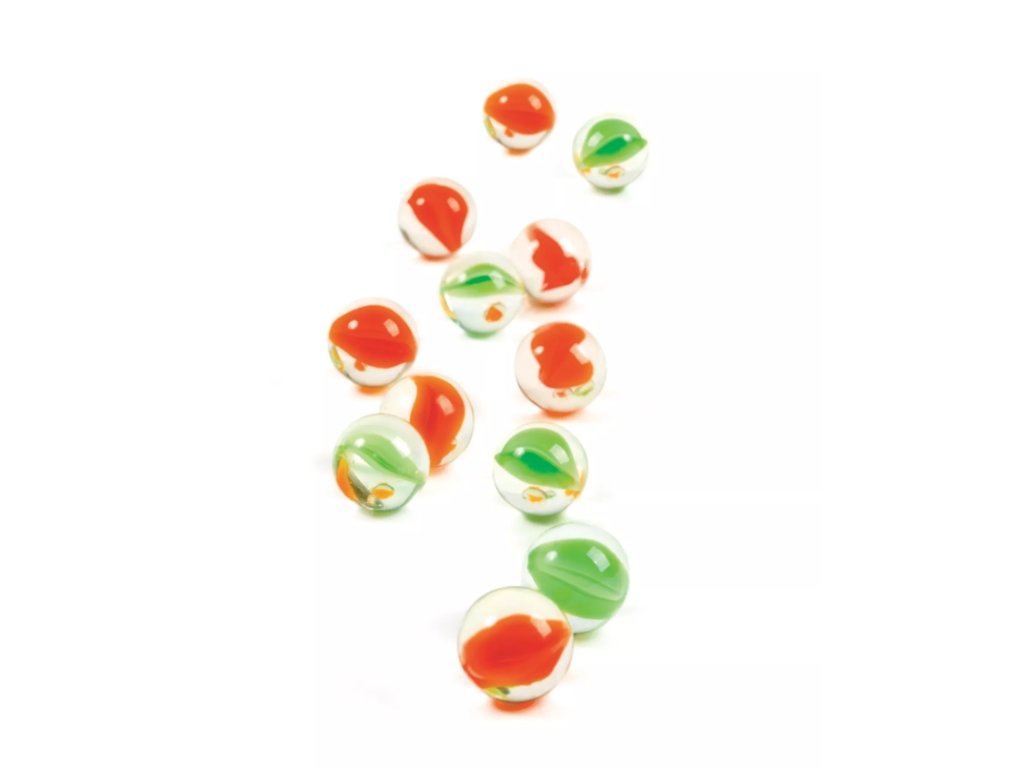 Hry v pytlíku – Kuličky obsahují: 20 barevných skleněných kuliček, látkový sáček, česká a slovenská pravidla.