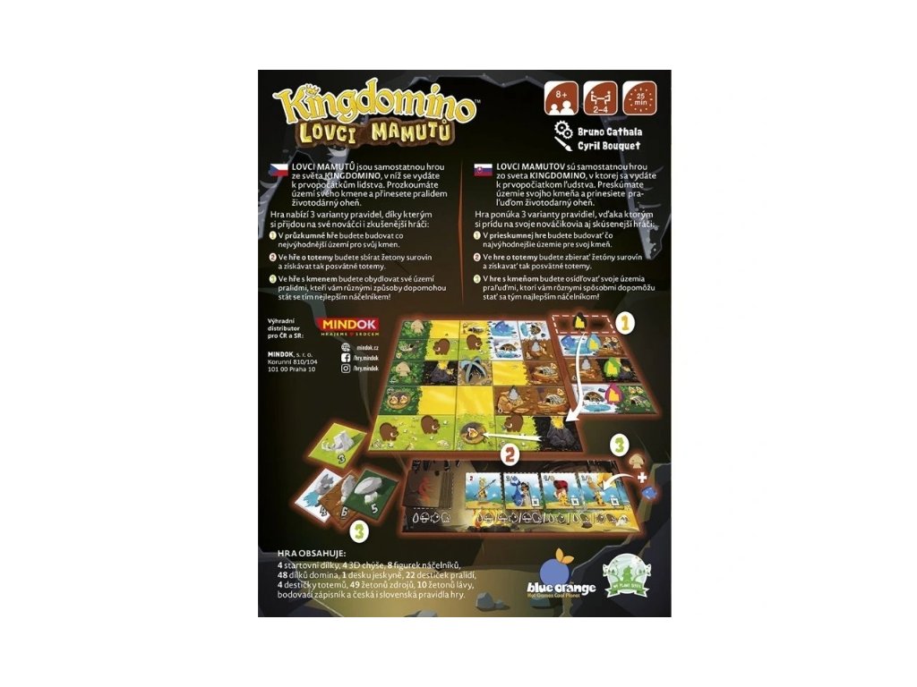 Lovci mamutů jsou samostatnou hrou ze světa Kingdomino, v níž rozvíjíte svůj pravěký kmen tím, že do nejrůznějších obydlených oblastí přinášíte oheň života!