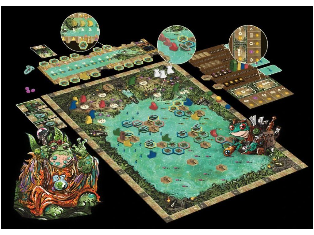 V Posvátné bažině zakládají klany nové osady, plují mezi ostrovy a snaží se získat co nejvíce vítězných bodů. Herní plán tvoří síť ostrovů se svatyněmi, které ovlivňují bodování a vytvářejí přirozená centra zájmu.