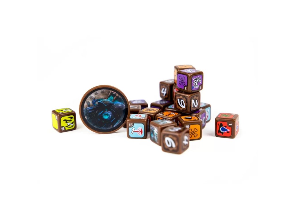 Ventil přichází s vlastní sadou 21 unikátních kostek, vyváženým žetonem vergla, uzavíratelným pořadačem na kostky a neoprenovou podložkou vergla s prošívanými okraji.