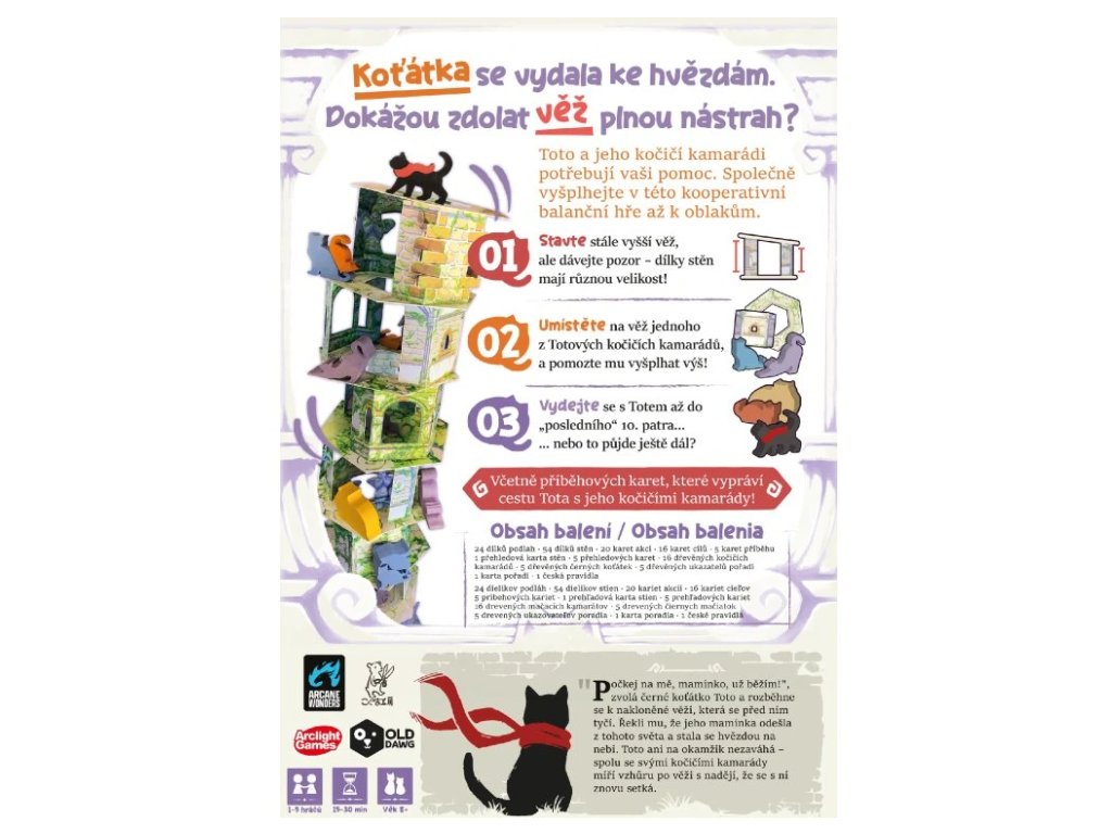 V každém kole se rozhodujete, zda budete pokračovat ve stavbě, nebo podstoupíte dovednostní výzvu, která prověří vaši přesnost a pevnou ruku. Čím výš se koťata dostanou, tím víc odvahy Tot získá. Společně se snažte postavit věž dost vysokou, aby se splnil jeho sen a on dosáhl až na hvězdy – zvládnete to dřív, než se celá stavba zřítí?