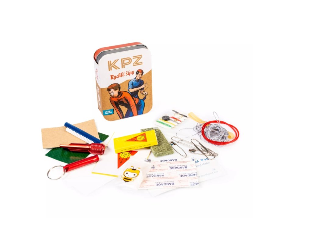 Krabička poslední záchrany - Rychlé šípy obsahuje: obyčejnou tužku, voděodolný papír 2ks, svíčku, sirky v krabičce se škrtátkem, přírodní podpalovač, provázek, svítilnu, voděodolnou náplast, kompresovanou utěrku, píšťalku, sterilní čtverec s dezinfekcí, šicí sadu s knoflíky, lepící pásku, plastový pásek 2ks, kancelářskou sponku, zavírací špendlík, gumičku, zrcátko.