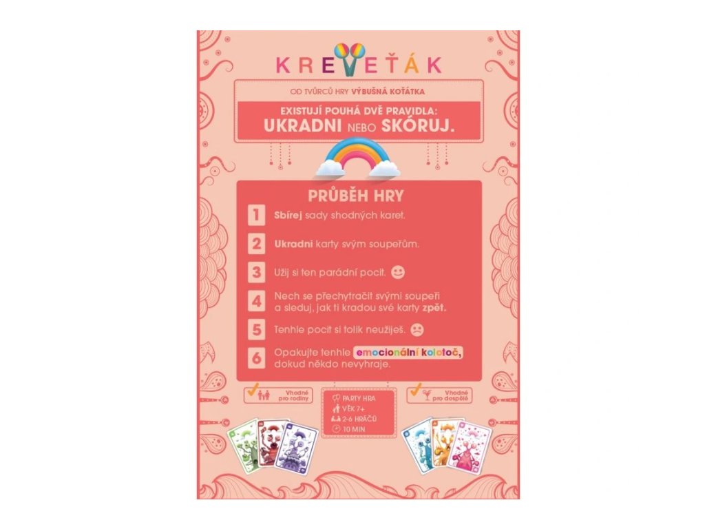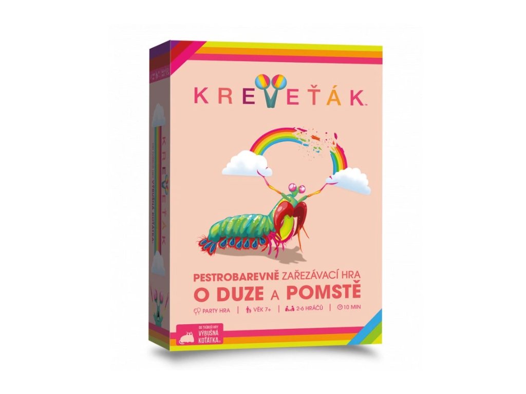 Chystáte se na party ke kamarádovi? Vezměte Kreveťáka! Jedete k babičce na návštěvu? Vezměte Kreveťáka! Chcete okořenit vaši rodinnou oslavu? Vezměte Kreveťáka! Jednoduchá a snadno naučitelná pravidla a svižná hra plná vtipných zařezávacích okamžiků! Jednoduše hra, kterou musíte mít vždy po ruce! A to jsme ani nezmínili, že se jedná o karetní počin z produkce Výbušných koťátek.