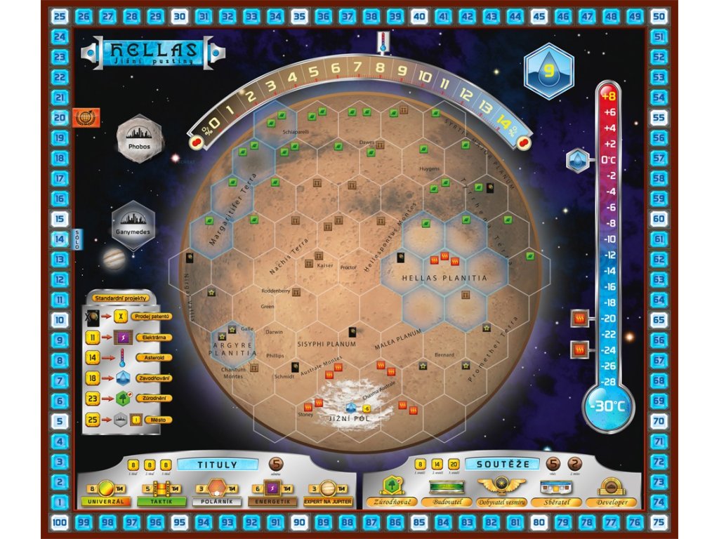 Ve hře Mars: Teraformace objevte nová území a vyzkoušejte nové strategie! Místo původního herního plánu můžete použít některý z obou nových. Znázorňují jiné části Marsu, jsou na nich vyznačeny jiné bonusy za umístění destiček, jiné oblasti pro destičky oceánu a nové čestné tituly a soutěže.