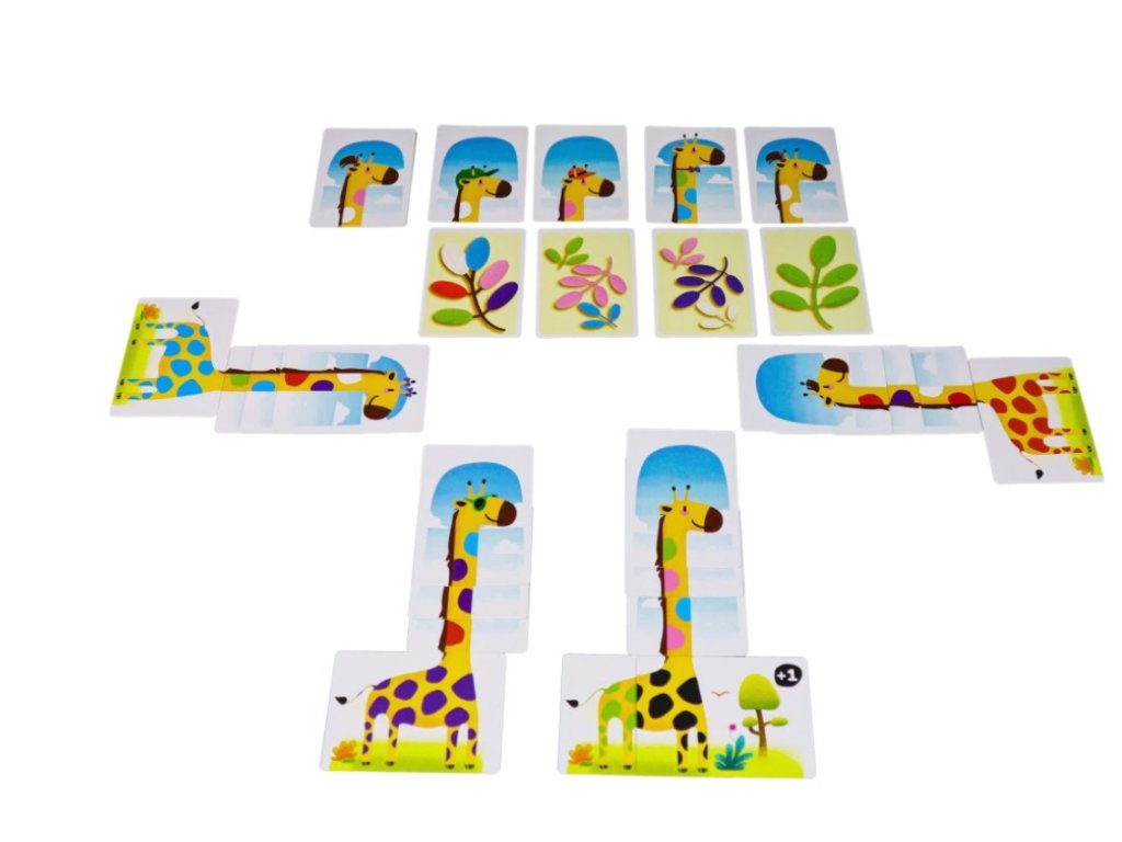 Na každé kartě je hlava žirafy s 1, 2 nebo 3 skvrnami na krku, které představují, co žirafa jí. Na rubu těchto karet jsou 1, 2 nebo 3 listy různých barev. Hráči se snaží popadnout kartu s hlavou žirafy v naději, že do konce kola najdou potřebné listy pro její potravu. Pokud se žirafa nají, její krk se prodlouží. Na konci hry vyhrává žirafa s nejdelším krkem!