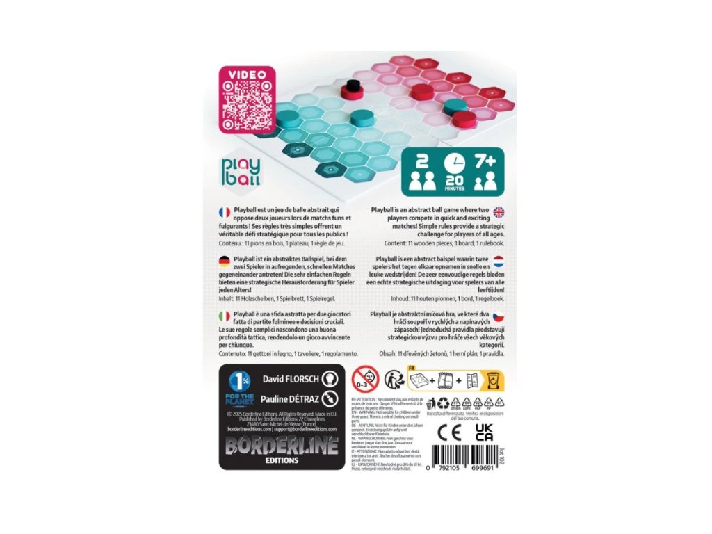 Playball je abstraktvní desková hra, ve které je vašim cílem vsítit tři góly soupeři. Každý z hráčů má k dispozici tři playballisty, kteří se mohou pohybovat po hrací ploše, nahrávat si či přeskakovat playballisty soupeře a obrat je o balón.
