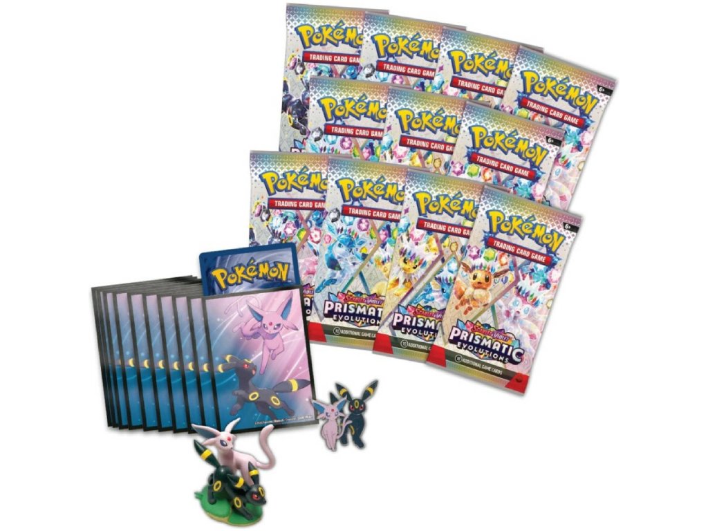 Obsah balení: 11 boosterů Pokémon TCG - Prismatic Evolutions 1 etched foilová promo karta Umbreon ex 1 etched foilová promo karta Espeoon ex 1 figurka Umbreon a Espeon 1 odznak Umbreon a Espeon 65 obalů na karty Umbreon a Espeon přístupový kód pro Pokémon TCG online hru