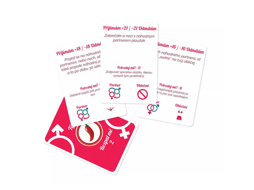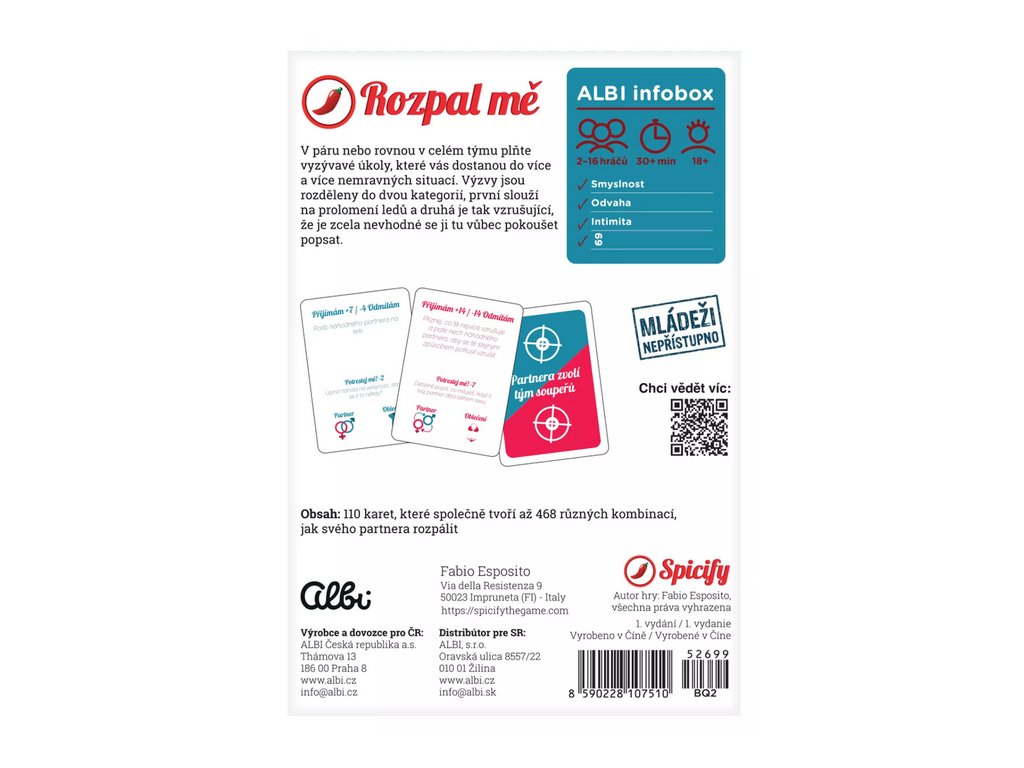 Hra Rozpal mě obsahuje: 110 karet, česká a slovenská pravidla.