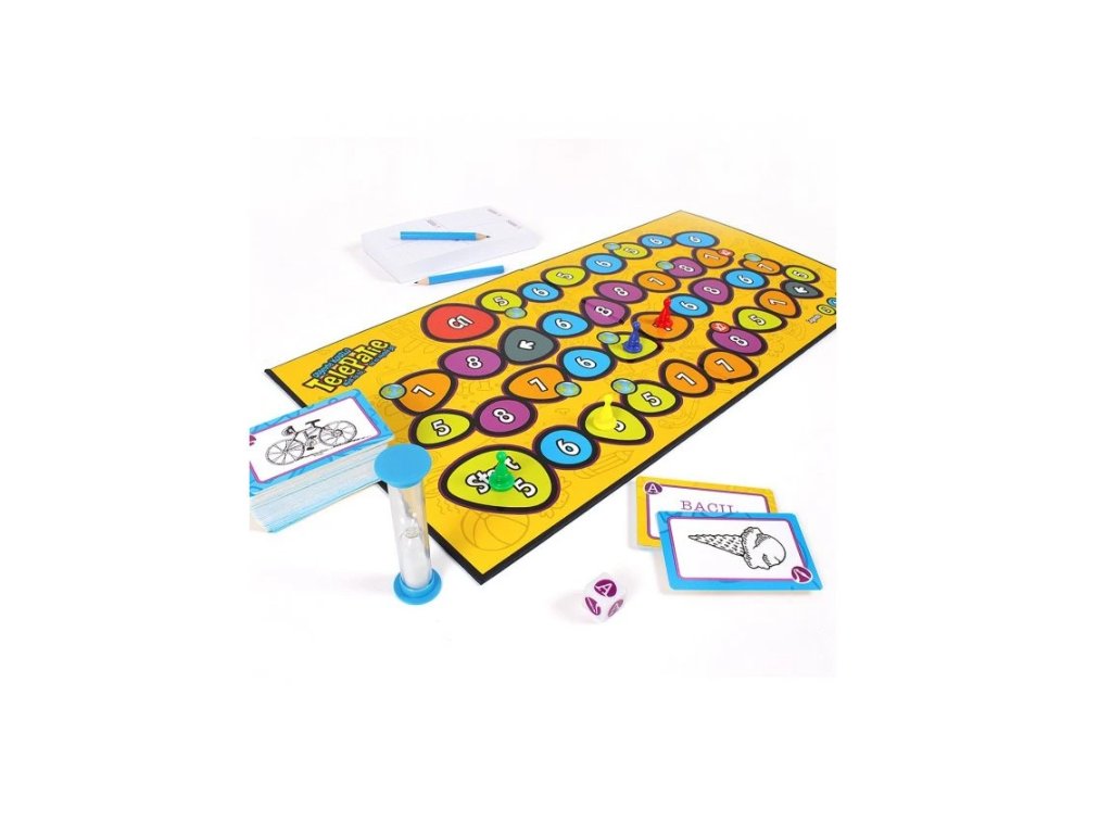 Hra obsahuje: herní plán, 330 karet, 4 hrací figurky, 4 tužky, zapisovací blok na skóre, kostka na obrázky/slova, přesýpací hodiny a pravidla