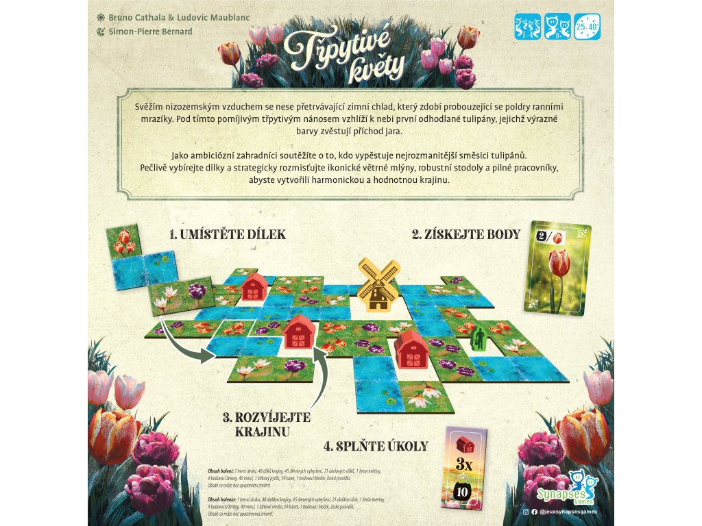 Jako ambiciózní zahradníci mezi sebou soutěžíte o to, kdo vypěstuje nejrozmanitější a nejhodnotnější tulipánovou zahradu. Pečlivě vybírejte dílky krajiny a strategicky rozmisťujte ikonické větrné mlýny, robustní stodoly a pilné pracovníky, abyste vytvořili harmonickou a bodově výnosnou krajinu.