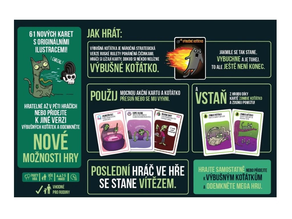 Čeká vás 61 nových karet s originálními ilustracemi. Můžete se těšit na karty s libým názvem „Nakrm smrt“ nebo „Kopej hloub“, ale tou největší bombou je dozajisté zombie koťátko, které vrátí mrtvého hráče zpátky do hry! Nicméně poslední hráč ve hře se stane vítězem!